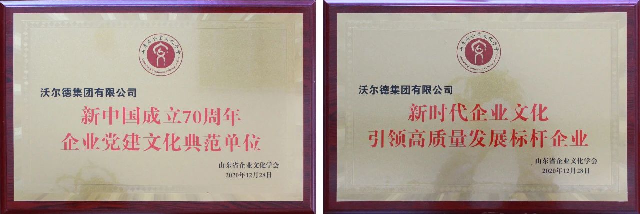 2020年12月28日-29日,由山东省企业文化学会主办的山东省企业文化高峰论坛暨《文化的力量》——山东省企业文化建设成果文集发行仪式在临沂隆重召开。期间,举行了山东省企业文化建设典型颁奖仪式。沃尔德集团荣获“新中国成立70周年企业党建文化典范单位”、“新时代企业文化引领高质量发展标杆企业”的称号,并接受表彰。