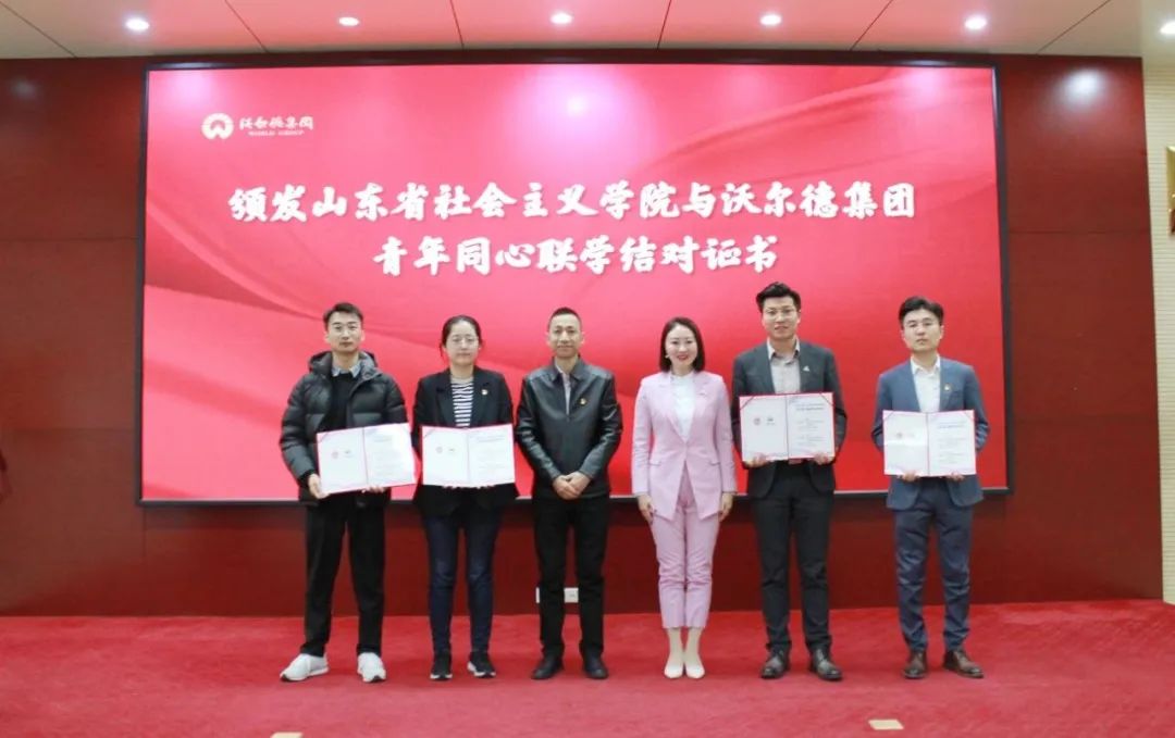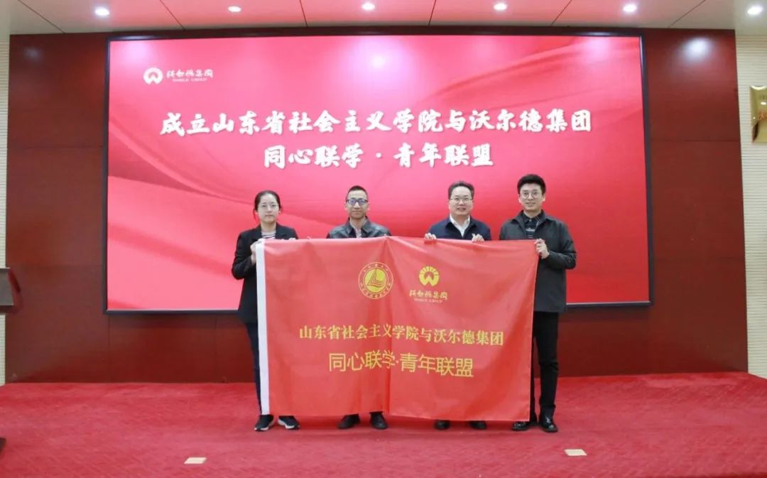 接着,为促进双方青年交流合作、互助互学,实现协同发展、合作共赢,省社会主义学院和沃尔德集团正式成立“同心联学·青年联盟”。孙黎海副院长与林擘董事长为双方青年代表授旗,并与集团总裁商雪梅为结对青年颁发“同心联学”结对证书。以此激发双方青年进一步坚定理想信念、立足本职工作,为奋力谱写新时代高质量发展新篇章积极贡献青春力量。