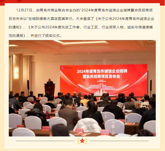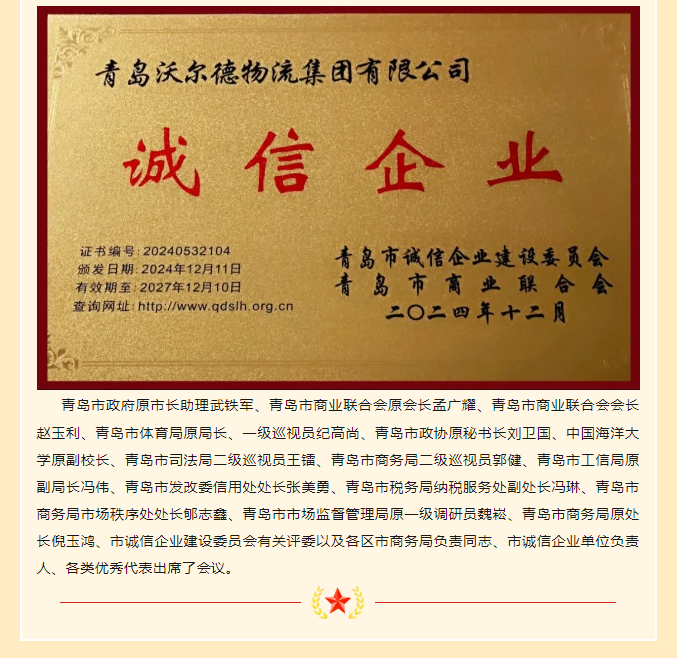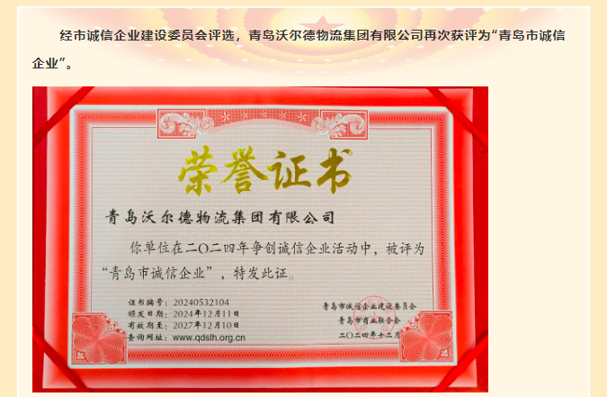 青岛沃尔德物流集团再次获评“青岛市诚信企业”