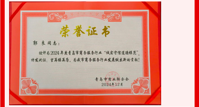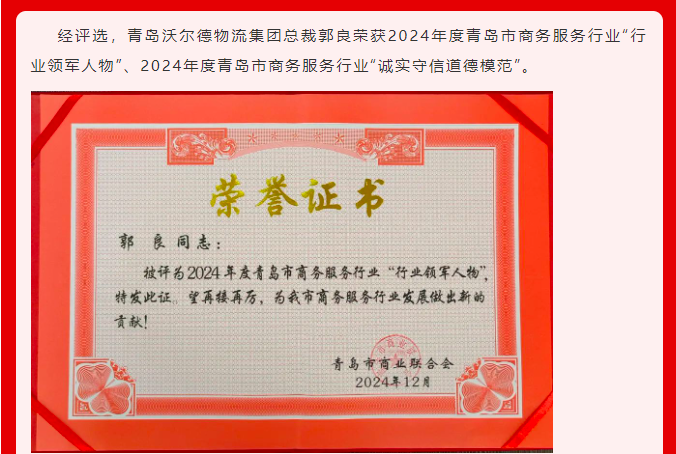 青岛沃尔德物流集团总裁郭良荣获“青岛市商务服务行业领军人物和诚实守信道德模范”