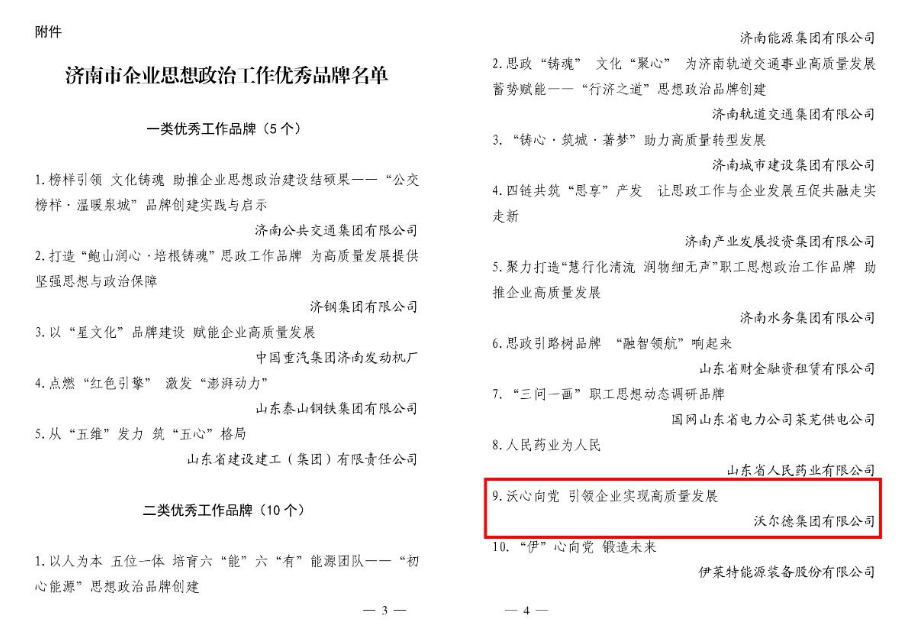 为《贯彻落实〈中共中央、国务院关于新时代加强和改进思想政治工作的意见〉的若干措施》(济发〔2021〕17号)文件精神,积极推动我市企业思想政治工作理念创新、方法创新,不断提升企业思想政治工作质量和水平,日前,市委宣传部、市国资委、市工商联和市政研会联合组织开展了全市企业思想政治工作品牌选树活动,评选出35个企业思想政治工作优秀品牌。沃尔德集团荣获济南市企业思想政治工作二类优秀工作品牌。
