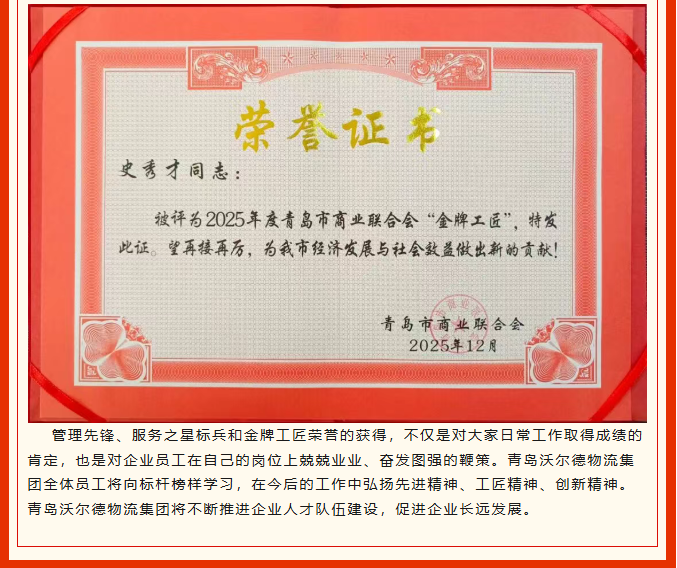青岛沃尔德物流集团邹黎明、程静等八人获评青岛市商务服务行业“管理先锋”、“服务之星标兵”、“金牌工匠”