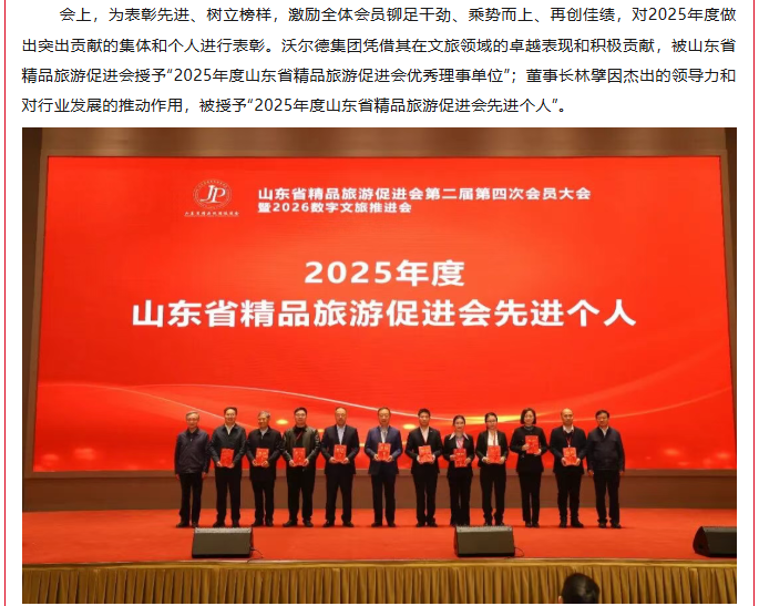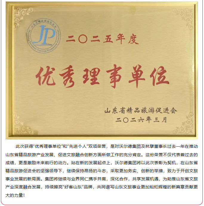 沃尔德集团与董事长林擘荣获2025年度山东省精品旅游促进会“优秀理事单位”和“先进个人”双项荣誉