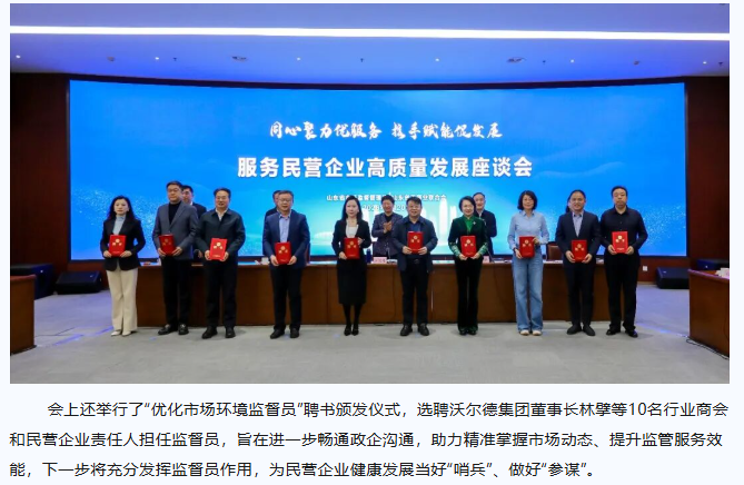 沃尔德集团董事长林擘获聘山东省市场监督管理局“优化市场环境监督员”