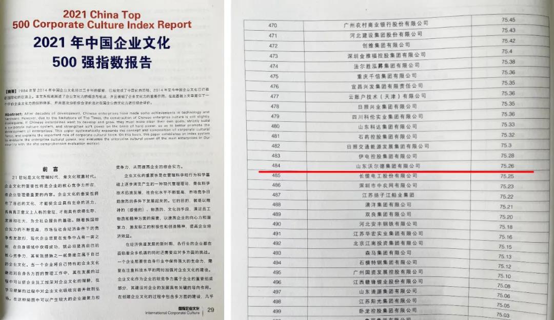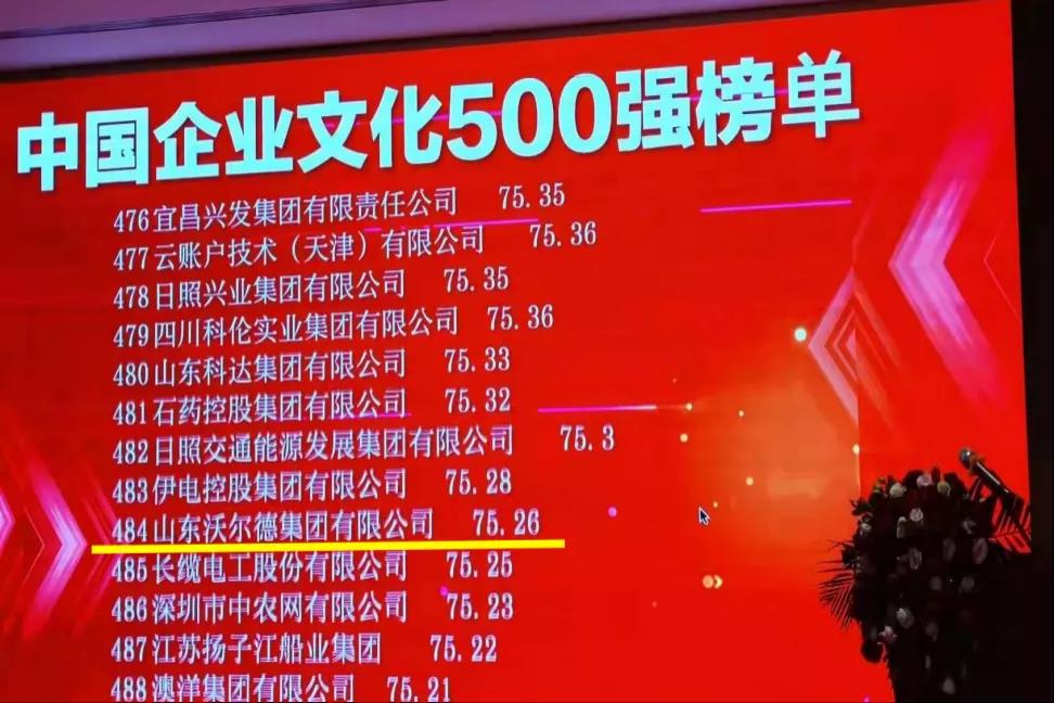 沃尔德集团自创立以来,高度重视企业文化的建设工作,确立了沃尔德的精神文化、制度文化、行为文化、物质文化,为集团发展提供了强大的精神引领,并落实到企业经营理念、战略制定、管理体系、人才发展等层面。此次集团荣膺“中国企业文化500强”殊荣,是对集团企业文化建设工作的充分肯定,也是对集团今后发展的一种激励和鞭策。