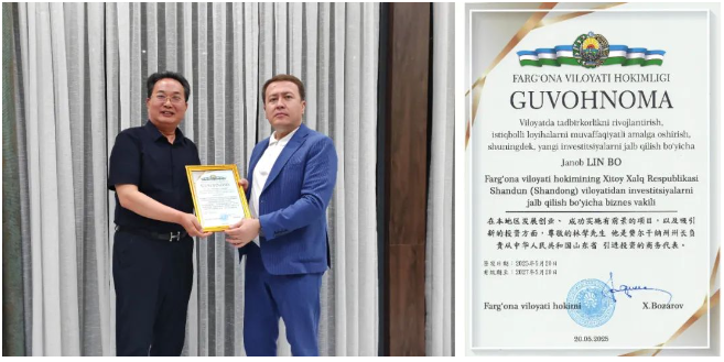 沃尔德集团与费尔干纳州政府签署合作备忘录,达成设立贸易公司的协议,将通过互设联络处等机制,推动双边贸易与双向投资迈上新台阶。费尔干纳州州长特别授予林擘董事长“商务代表”称号,由其具体负责从中国山东省引进投资。