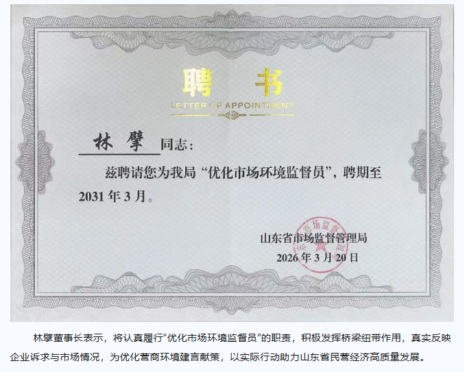 沃尔德集团董事长林擘获聘山东省市场监督管理局“优化市场环境监督员”